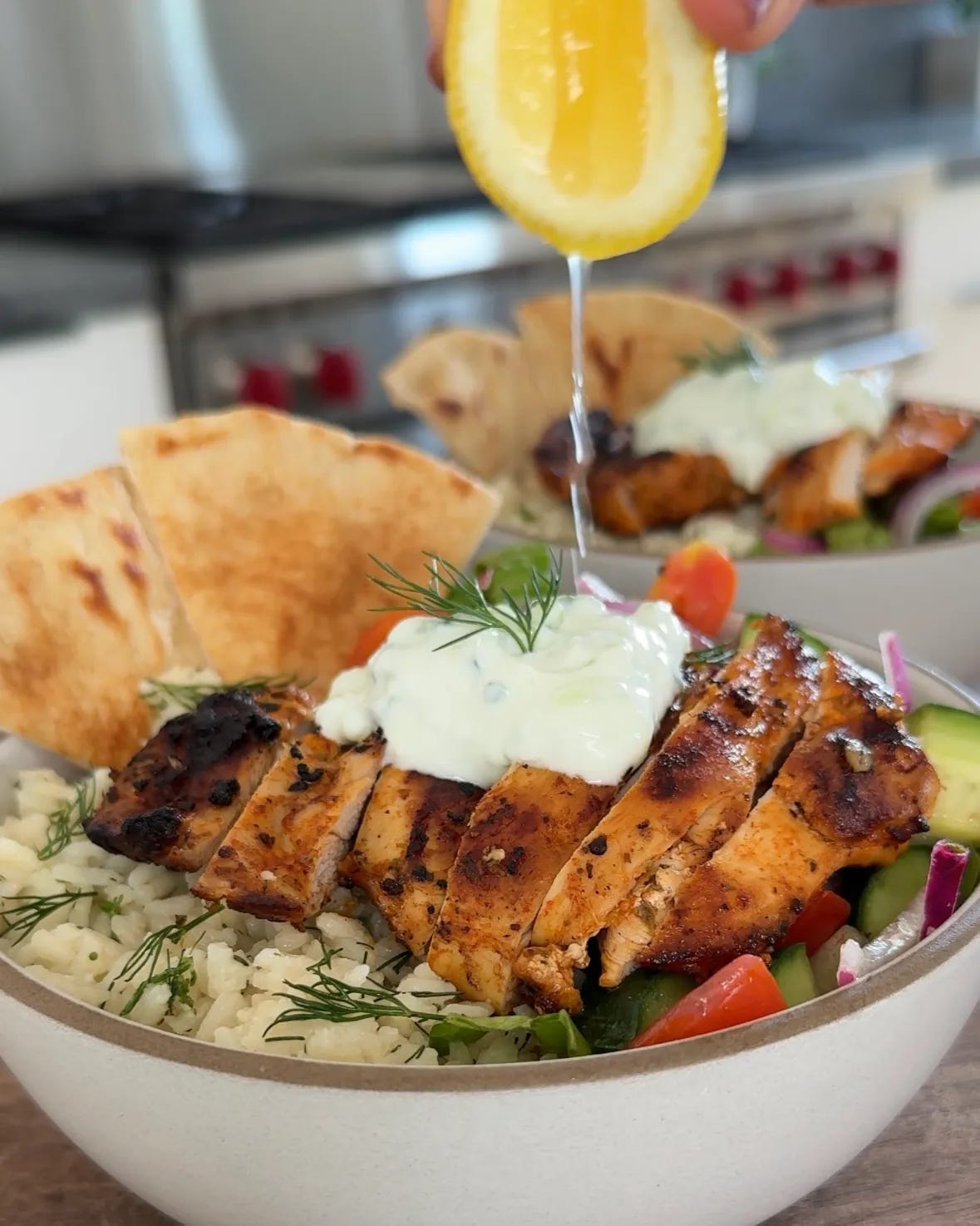 By now you probably know that Doug loves anything with tzatziki, so this is a meal I make often. The bowl comes together with lemon-dill rice, a fresh crunchy salad, and chicken marinated in lemon, garlic, oregano, and spices. I love how all the components work together and can be mixed and matched. It’s a fun, satisfying meal that hits all the right notes.