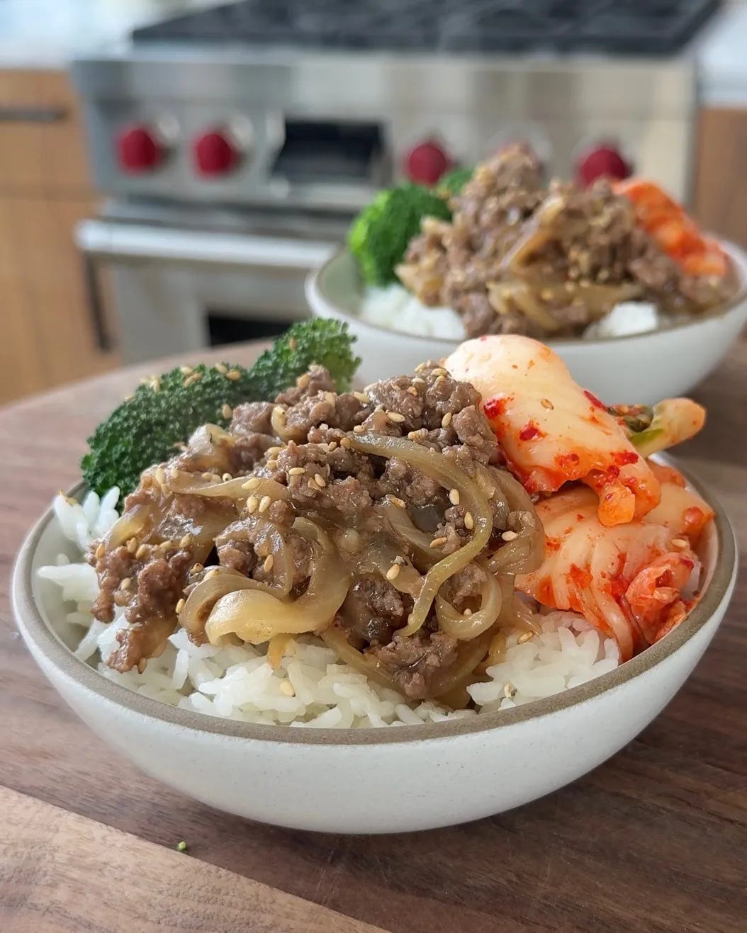 This dish is incredibly easy and comes together in about 20 minutes. It’s nicely balanced with flavorful beef and onions inspired by Korean BBQ, plus kimchi, which is always great for gut health. I serve it with broccoli cooked in the microwave to keep things extra simple. Everything gets spooned over white rice to soak up the delicious marinade.