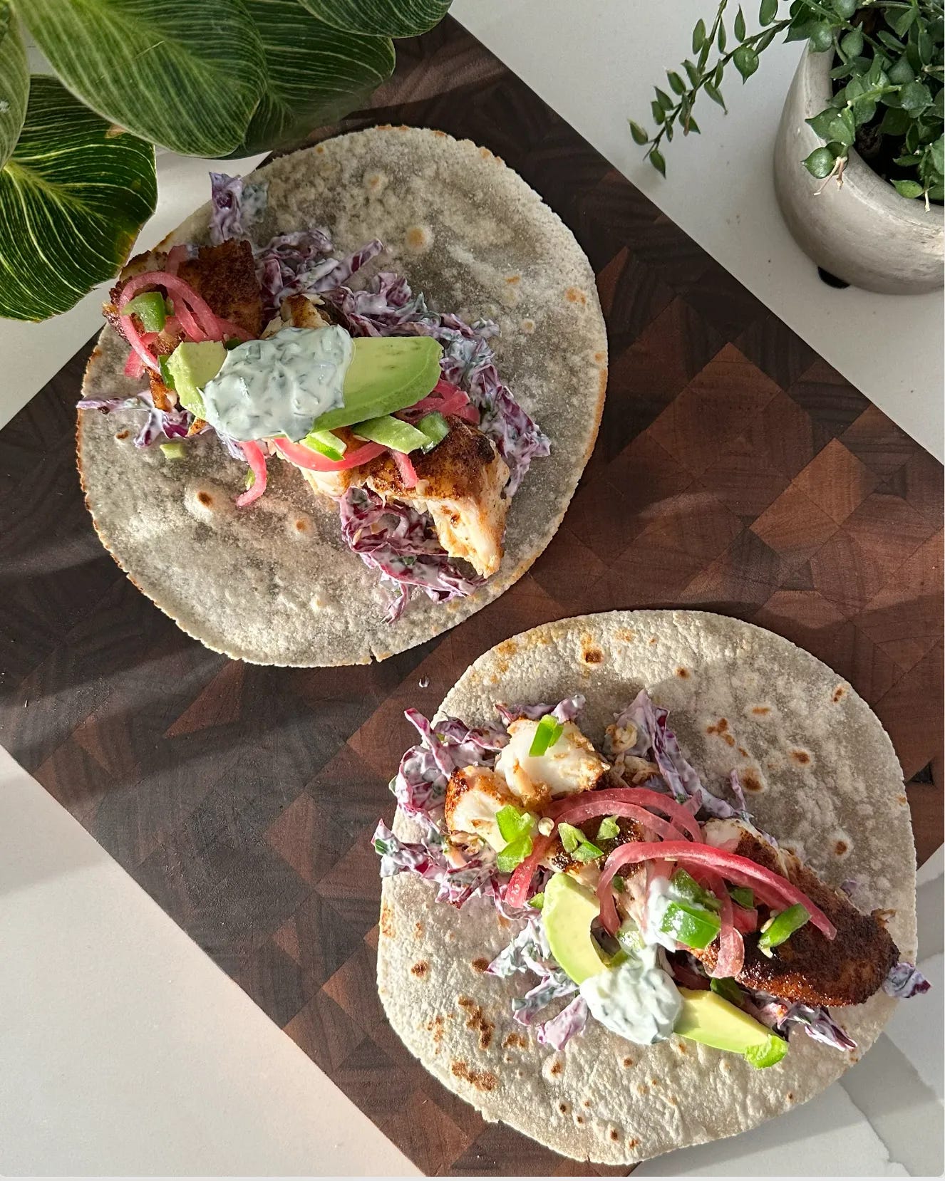 I’ve been making these tacos for years, and they always feel light, nourishing, and so fun to eat. The flavors are similar to a shrimp taco recipe in my cookbook. I make them with tilapia here, but any white fish you love will work. The fish is seasoned with a punchy spice blend and topped with a tangy cilantro-lime yogurt slaw, slices of avocado, and homemade pickled red onion. I like using Siete Foods cassava tortillas, toasting them in a skillet for about 15 to 30 seconds per side, then assembling the tacos right away so everything stays warm and fresh.