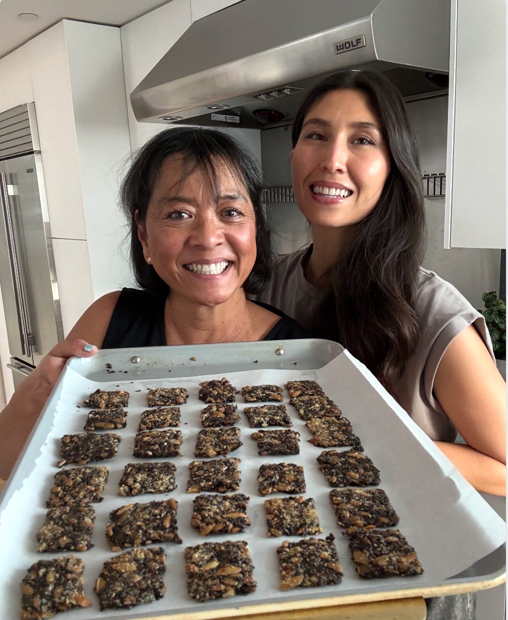 My brother’s girlfriend gave my mom a recipe for these delicious, healthy seeded crackers. They’re incredibly simple to make. You just pour boiling water over a bunch of seeds with a little olive oil. The flaxseeds and chia seeds form a gel that binds everything together. Then you spread the mixture onto a sheet pan, sprinkle a little Parmesan and salt on top, and bake.