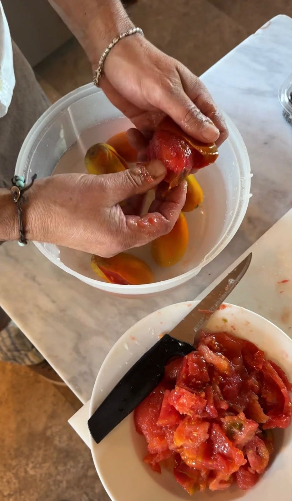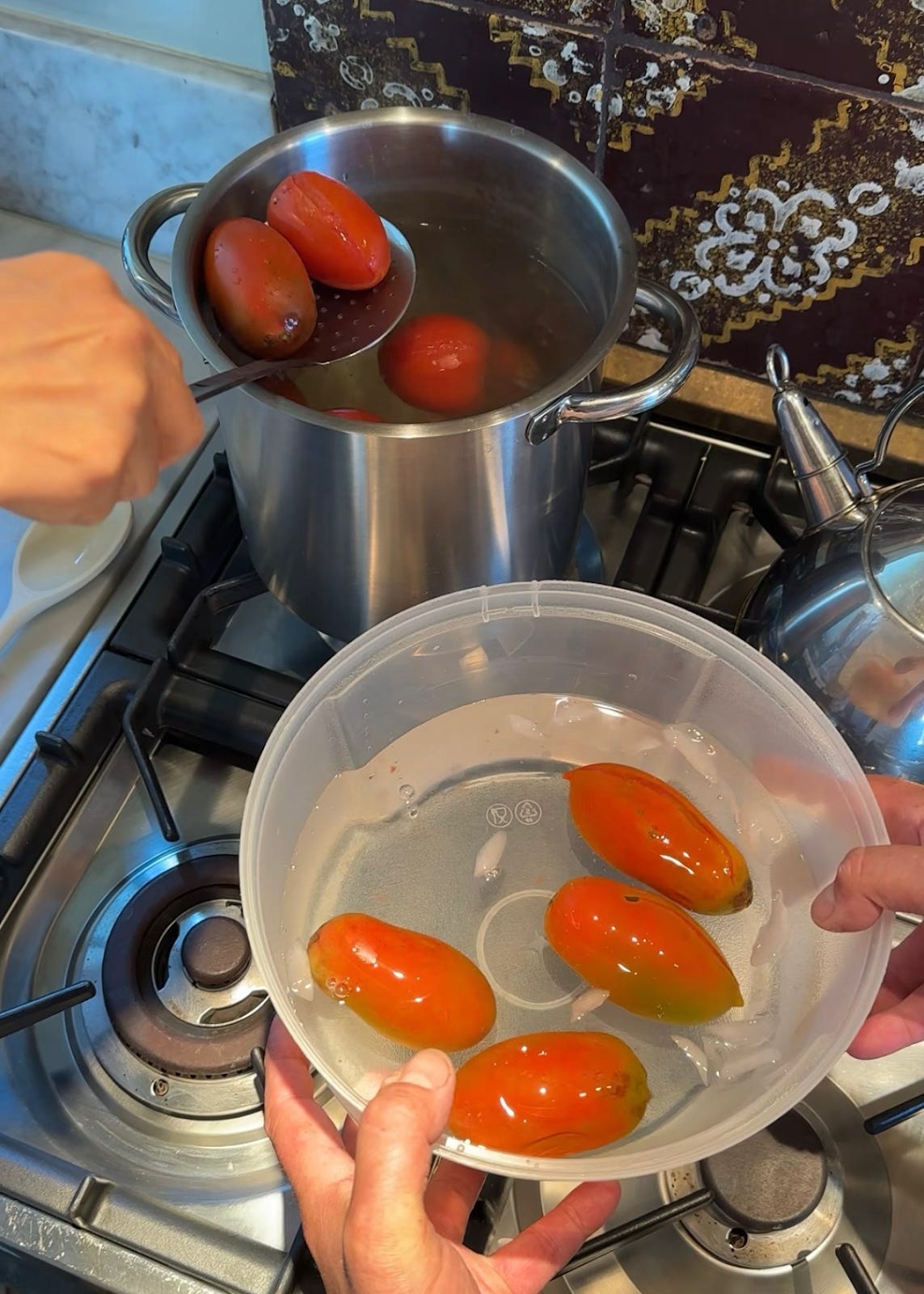To peel the tomatoes, you boil them for a few minutes until their skin splits, then dunk them in ice water to cool them down. This makes removing the skin a breeze—it slips right off.