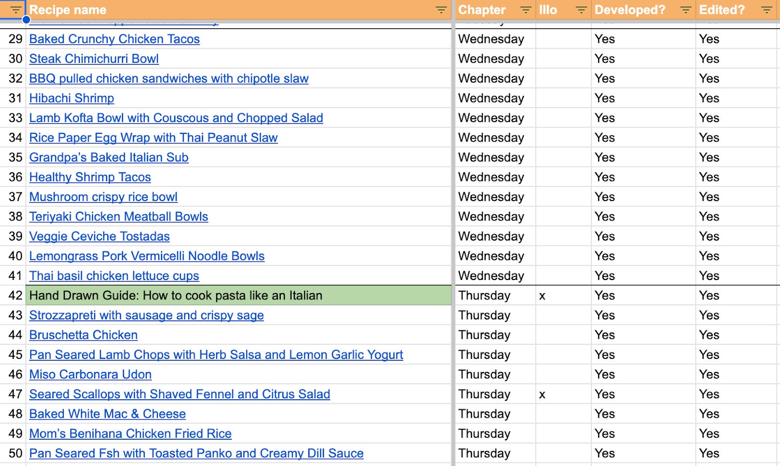 About a year later, publishers began reaching out to ask if I’d considered writing a cookbook. I signed with a literary agent, who helped me put together a proposal. It included my story and why a publisher should take a chance on a first-time author. I also outlined the concept: easy, go-to recipes you can make again and again. From the beginning, I knew I wanted chapters that each represent a day of the week. My agent sent the proposal to editors, and we ended up having 11 meetings. Half were in person in New York City, all in one day. It felt really big and exciting, and I even bought myself a new jacket for it! Long story short, I sold my cookbook to my dream publisher, Clarkson Potter, an imprint of Penguin Random House.