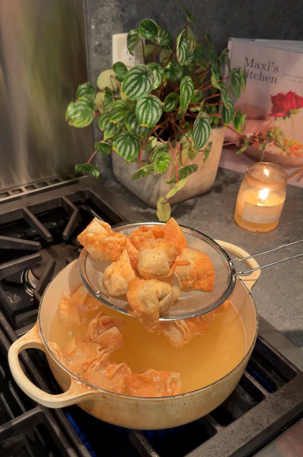 Then I made fried wontons, a twist on the boiled version in my book. It’s something my family has made for years, especially around the holidays. You heat about three inches of peanut oil in a large pot until it reaches 350ºF on an instant-read thermometer, then add the wontons and fry until golden. I like to serve them with sweet and sour sauce and a little S&B hot mustard.