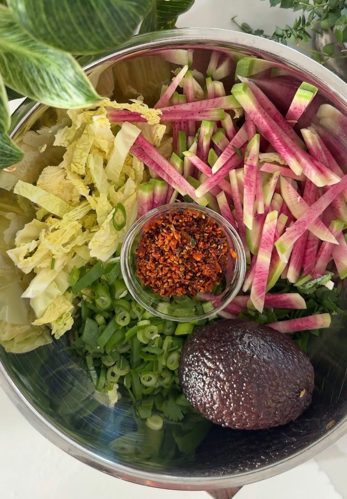 Make the salad: To a medium bowl, add the watermelon radish, cabbage, scallions, cilantro, and avocado.