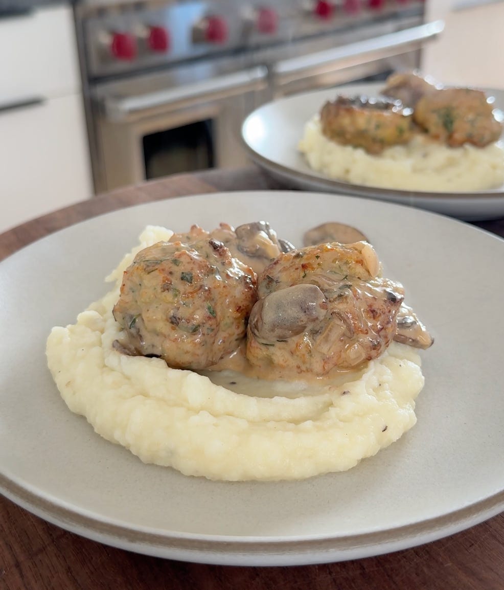 These meatballs turn out perfectly moist from breadcrumbs soaked in milk and grated Parmesan. They get simmered in a creamy mushroom sauce, which is so delicious served over mashed potatoes.