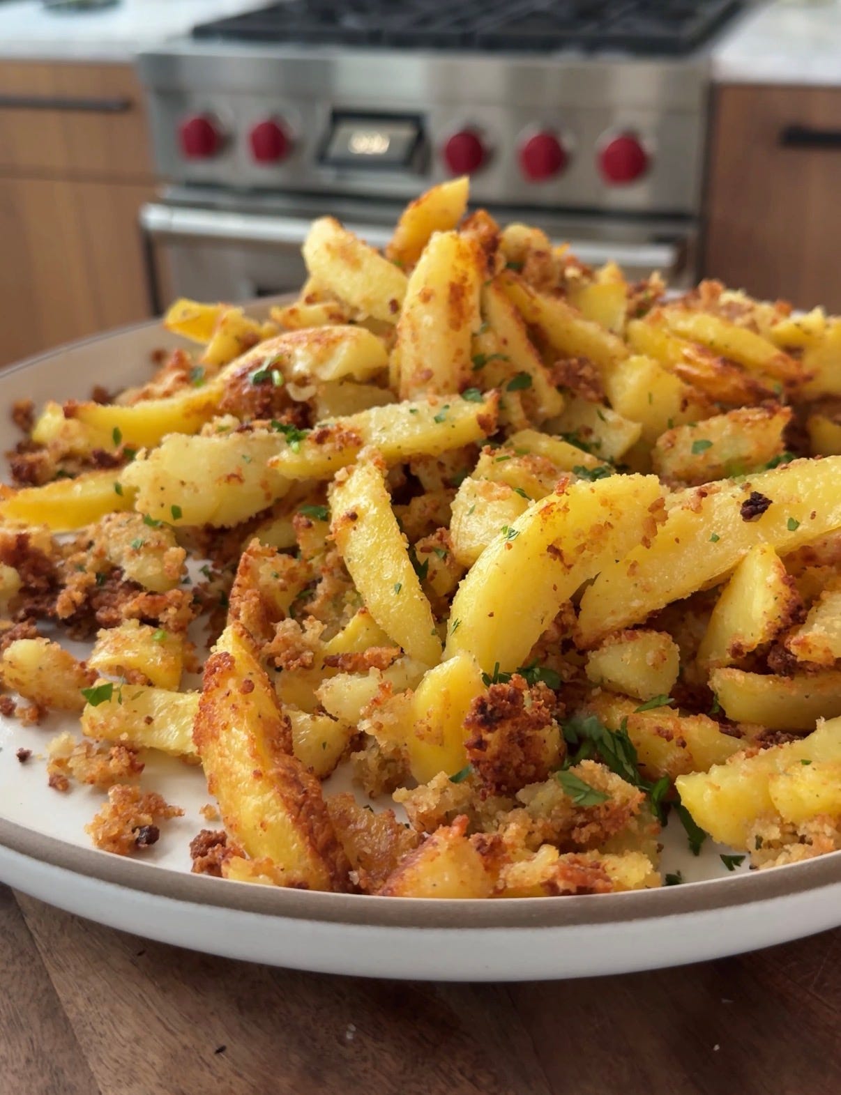 These potatoes are covered in crunchy bits from a mixture of olive oil, Parmesan, and breadcrumbs, while the insides stay pillowy and tender.