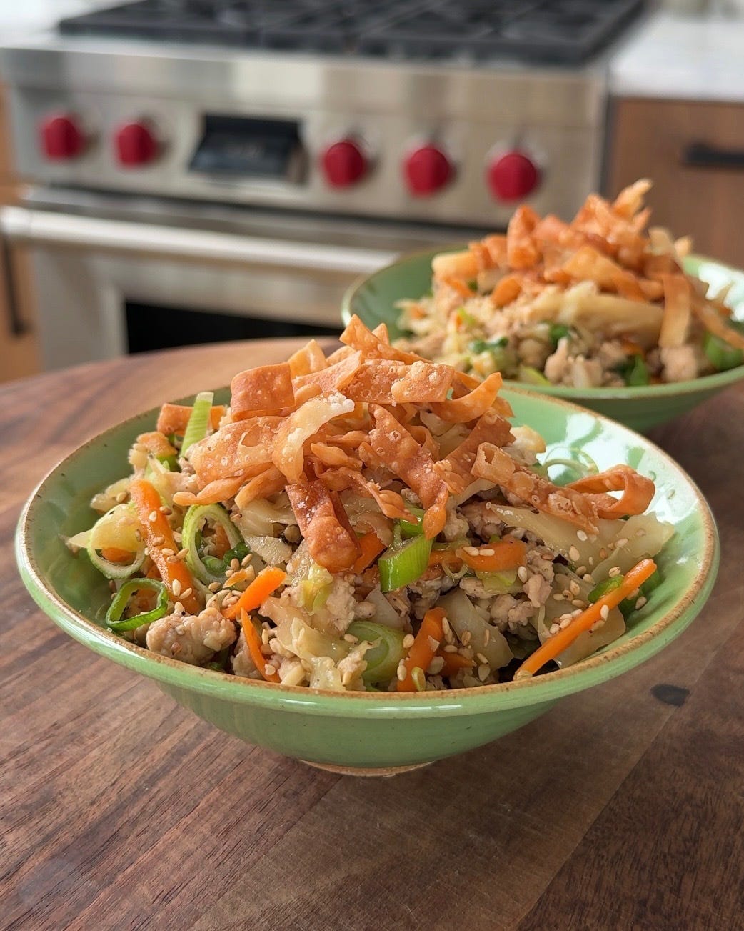A super easy recipe packed with Asian flavors and a crunch in every bite from the water chestnuts and crispy wonton strips.
