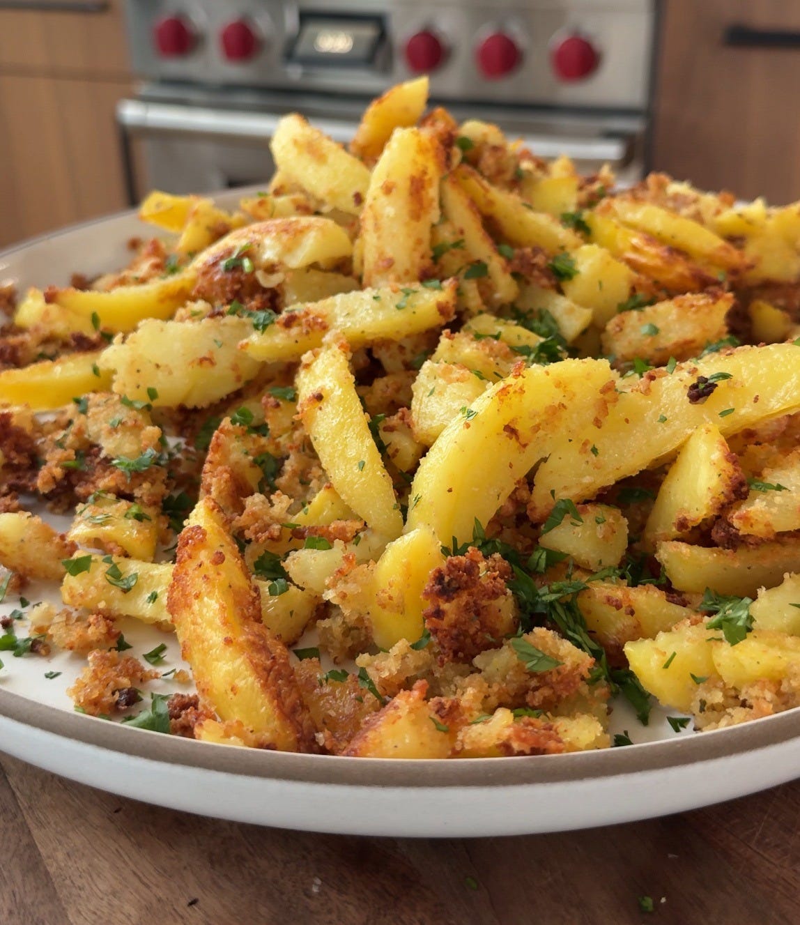 Our last recipe of the day was crispy Parmesan potato wedges. You parboil the potatoes, toss them with breadcrumbs and Parmesan, and bake until golden and crispy. The coating creates all these delicious crumbly bits. Since it’s almost winter and the days are so short, we were scrambling to get the final shots before it got dark. I only film with natural light, so timing is always tricky at this time of the year.