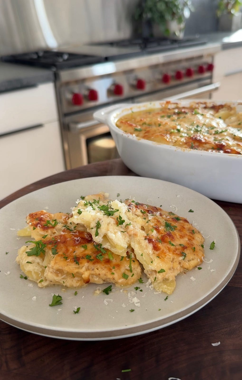 My version has just the right amount of cheese for a golden, melty crust. And to avoid that classic issue where the potatoes take forever to cook, I par-cook them in whole milk first. It gives them a creamy flavor and ensures they’re perfectly tender by the time they come out of the oven. This way you know exactly how long they need to bake—no more holding up the meal waiting on the potatoes!
