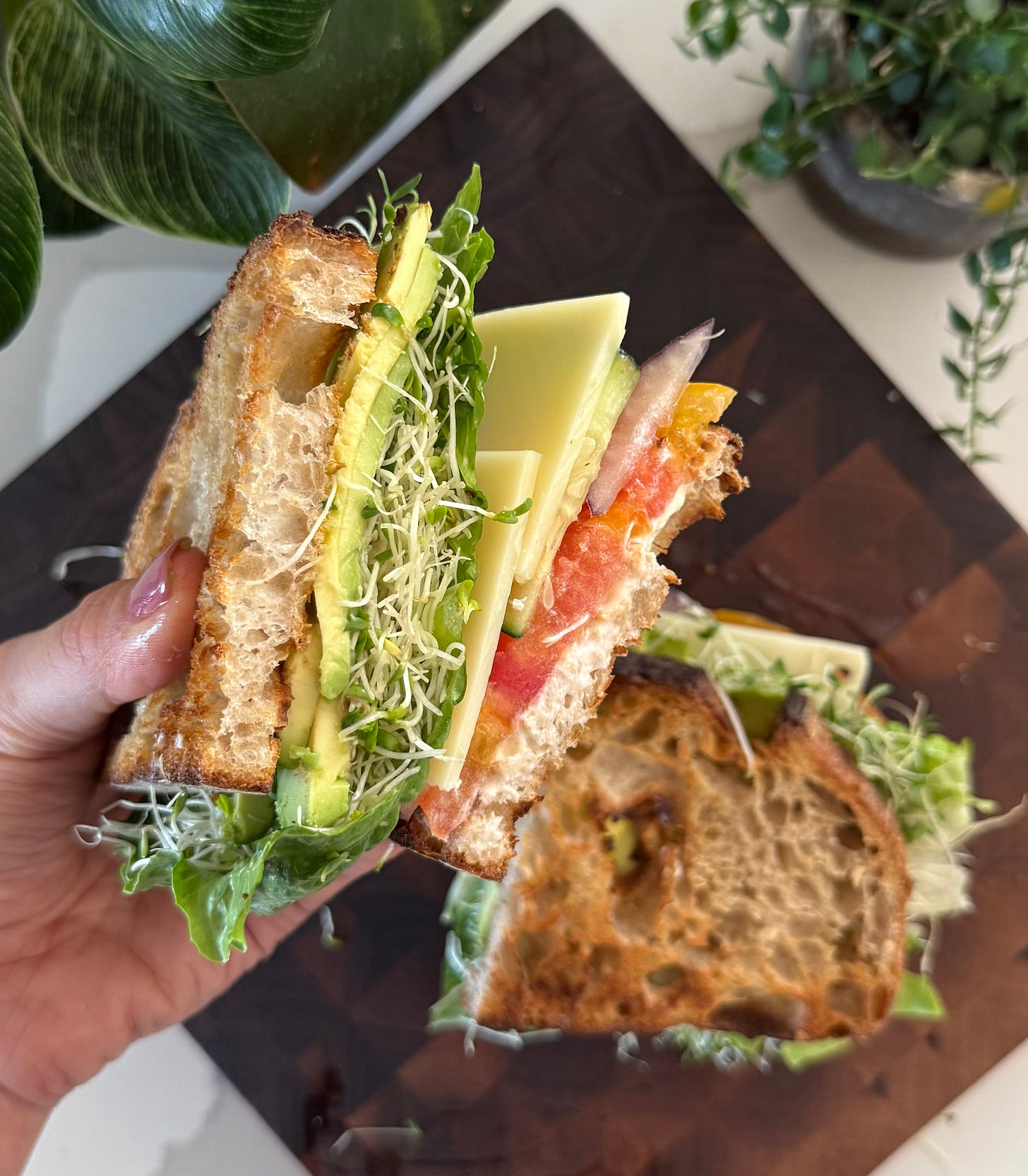 First, here’s a recipe for my favorite veggie sandwich. It’s packed with avocado, cucumber, sprouts, and other delicious ingredients—and trust me, even meat-lovers will enjoy it!