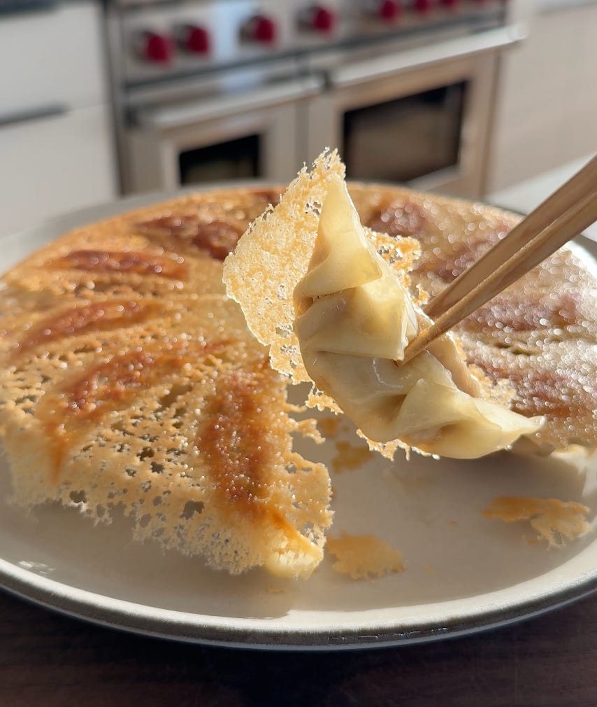 My mom and I discovered this technique for crispy gyoza in Tokyo and it blew our minds. The crispy skirt is called “hane” in Japanese and is so simple to make, with just flour, cornstarch, and water.