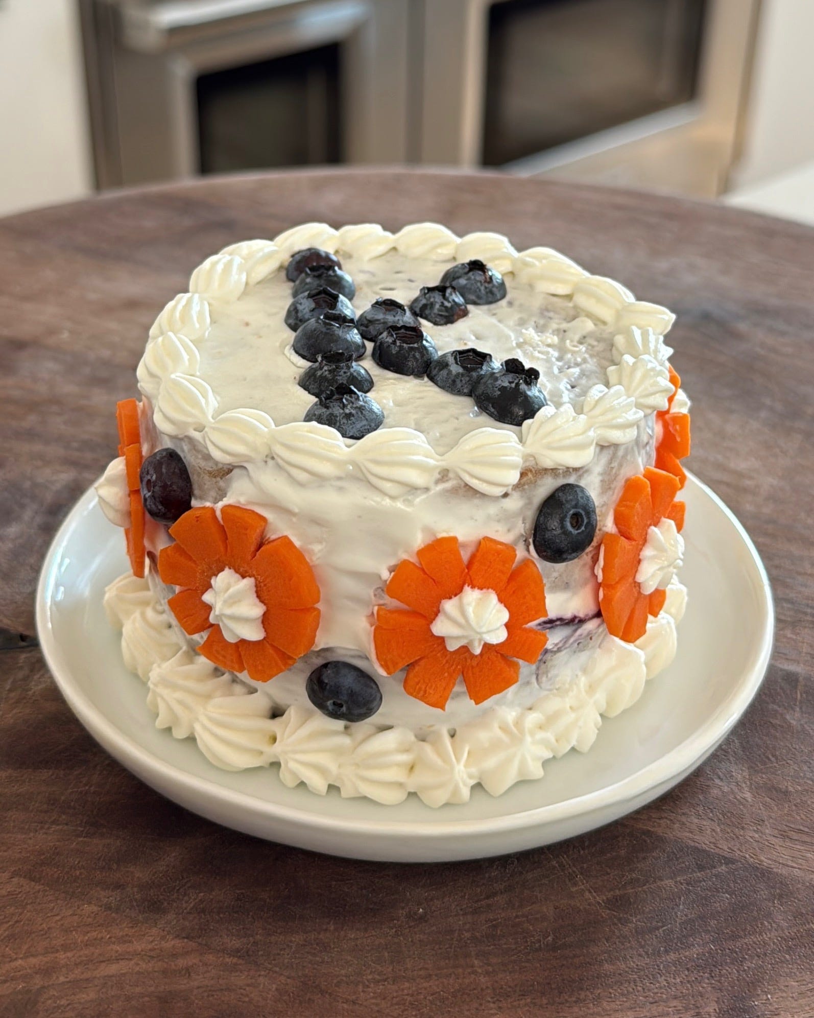 This is the doggy cake I made for Kimchi’s birthday. It has banana, peanut butter, blueberries, and a little cream cheese. She loved it so much, she devoured it in (almost) one bite!