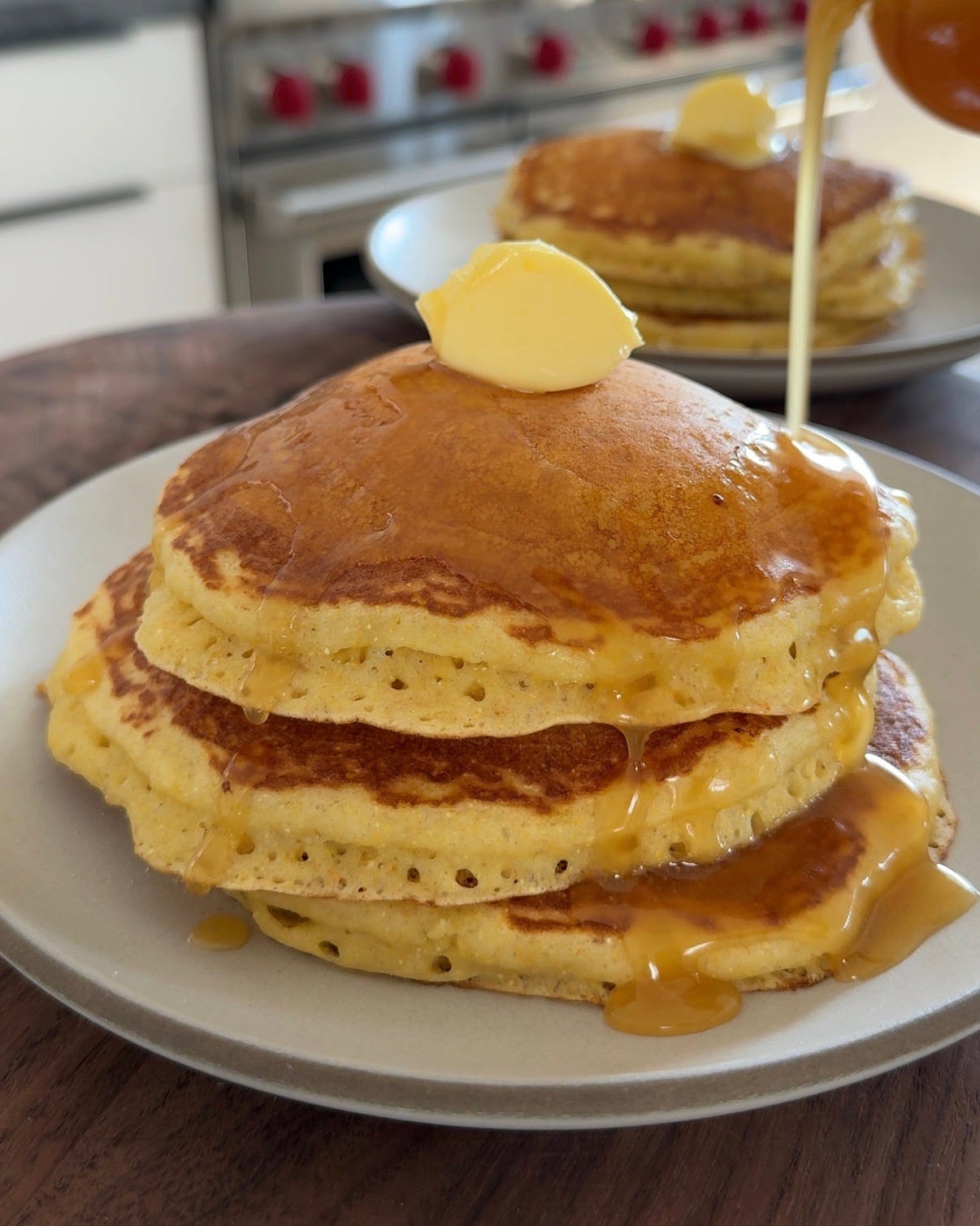 These are from my mom, the queen of fluffy pancakes. Imagine pillowy melt-in-your mouth centers with texture pops from the cornmeal and plenty of honey butter drizzled on top.