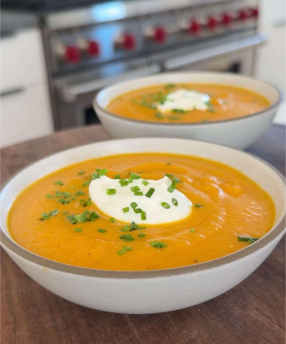 First, here’s a recipe for a healthy carrot ginger soup my mom and I have been making for years. It’s made with just a few ingredients (carrots, onion, and lots of fresh ginger) and has such a smooth, creamy texture. Served with a dollop of sour cream and a sprinkle of fresh chives, it’s so delicious.
