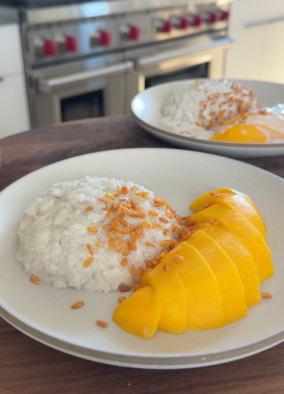 I became obsessed with mango sticky rice in Thailand. It’s subtly sweet with a touch of salt, and has this creaminess from the coconut milk. The chewy rice pairs so well with the fresh mango.