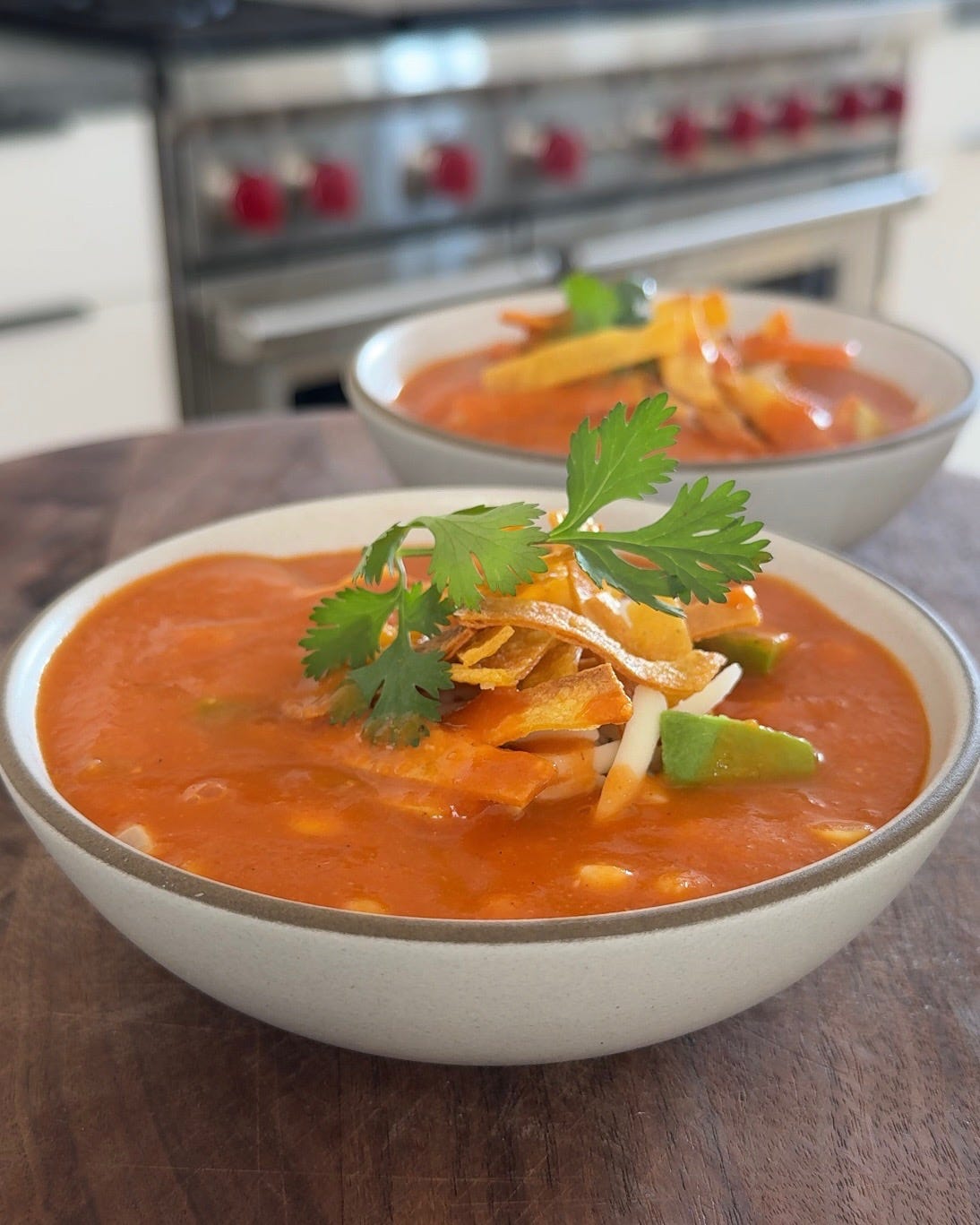 My mom fell in love with tortilla soup in Mexico City, where she learned to serve it like this: first add the crispy, crunchy, cheesy elements to the bowls, then ladle on the flavorful soup.