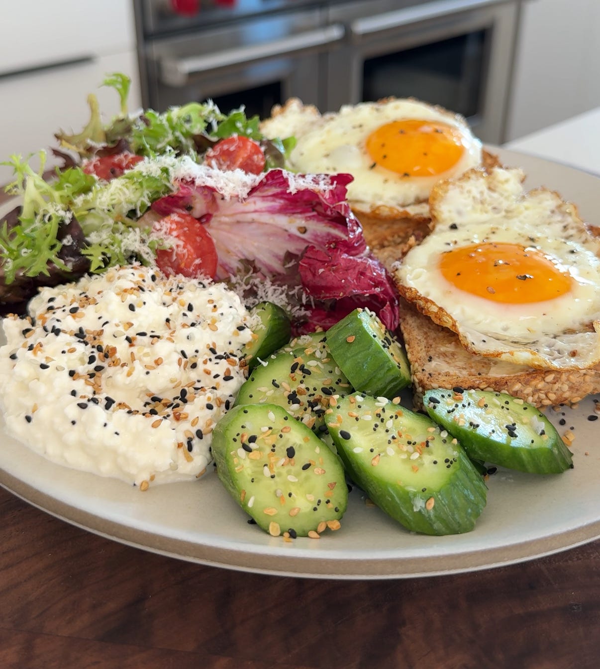 A quick and healthy lunch with a bunch of elements to mix and match. Cottage cheese and eggs for protein, cucumber for crunch, and everything bagel seasoning to tie it all together.