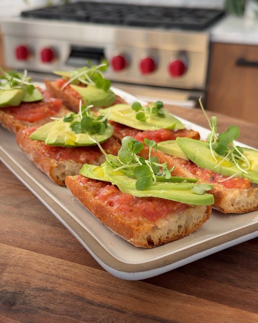 Inspired by a dish I had in Spain, this is a twist on the classic pan con tomate. The toasted bread is topped with freshly grated tomato and slices of creamy avocado.