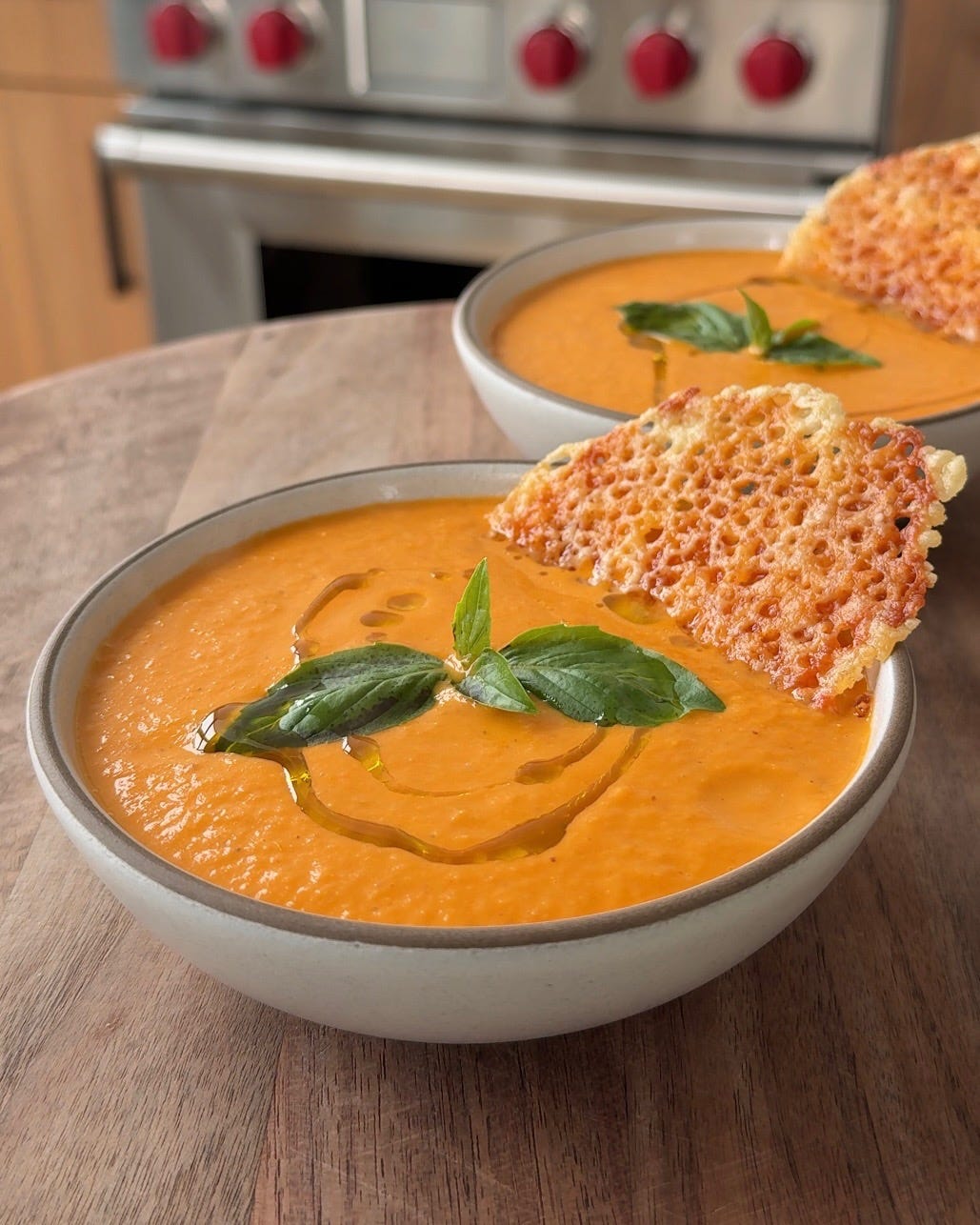 The secret to the best tomato soup is roasting the tomatoes and aromatics in the oven until they’re sweet and jammy. Blend with some milk for a creamy finish.