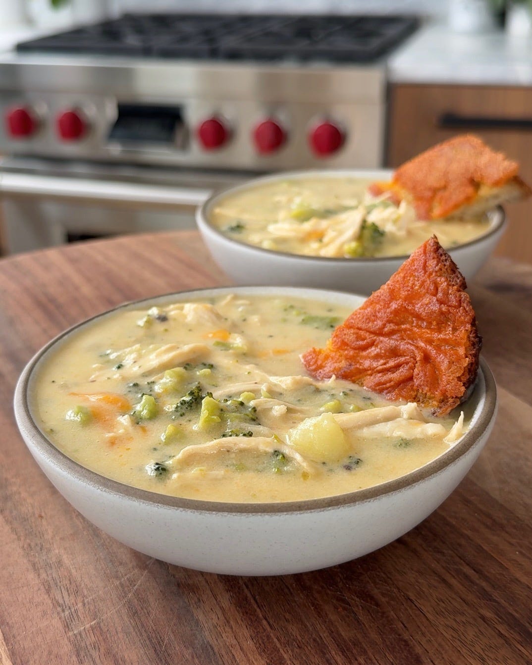 Chicken Broccoli Cheddar Soup with Crispy Cheese Toast
