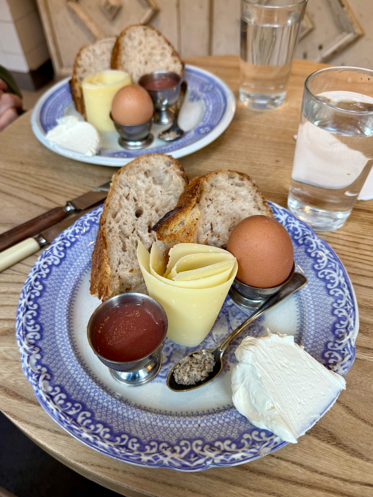We started with breakfast at Atelier September. There was a bit of a line, and we wondered if it was worth the wait. We each ordered the Danish breakfast: two thick slices of sourdough bread, a jammy boiled egg, Comté cheese, flaky sea salt, a small bowl of jam, and the most incredible whipped butter. It looked simple, served on a single plate, but it was unbelievably good. Doug said it was the best bread he’d ever had. The crust was super crunchy and the inside chewy, with that deep sourdough tang. I kept tearing off pieces to build different combinations: cheese alone, cheese and jam, butter and jam. It reminded me that all you really need are a few top-quality ingredients to make something special.