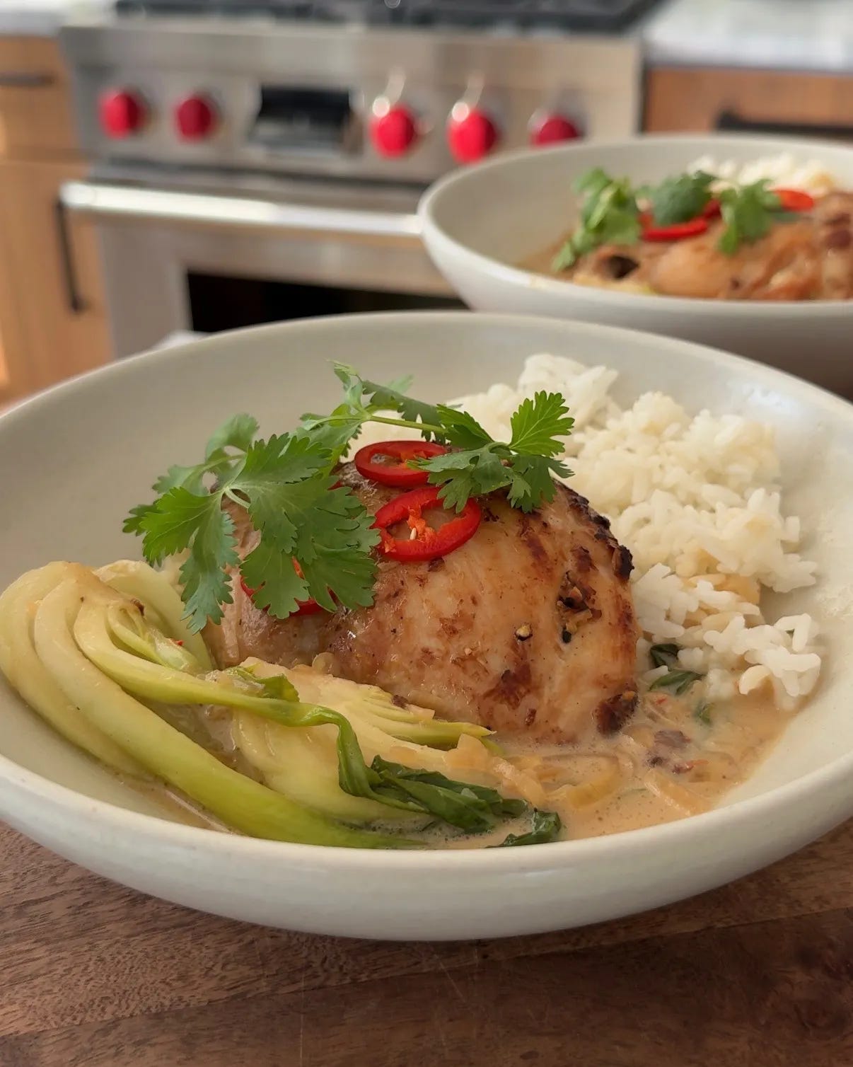 This dish is so fantastic and surprisingly easy to make. It’s beautifully balanced and packed with flavor. First you marinate chicken with seasonings and lemongrass, which gives it a lovely citrusy aroma. (I can usually find lemongrass at a regular grocery store.) Then you make a coconut broth with shallots, chili for a bit of heat, and a splash of fish sauce. The result is creamy, tangy, and incredibly comforting. I recommend serving it over freshly cooked jasmine rice to soak up all that broth.