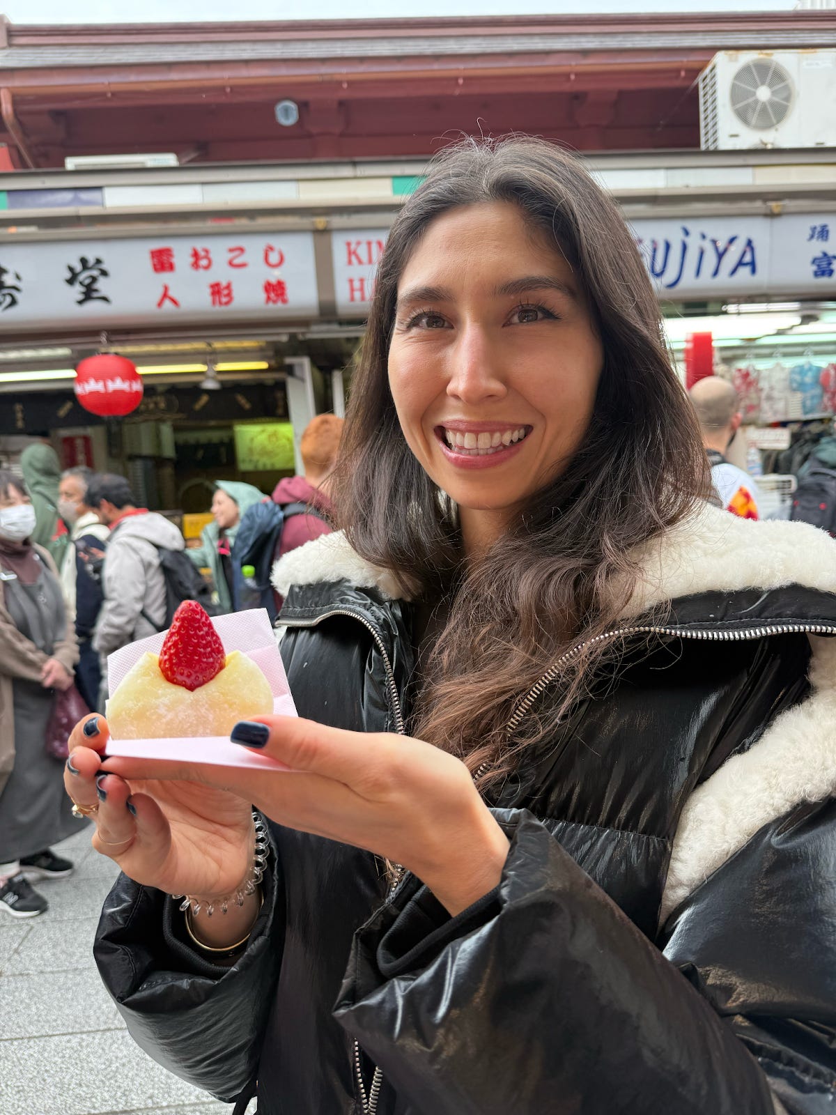 We started at Sensō-ji temple, where the street outside is lined with incredible food vendors. We ate daifuku (custard-filled mochi with a strawberry on top), one of my mom’s favorite treats in Japan, and we also tried a delicious Hokkaido milk serve. I finally got to taste tanghulu (candied strawberries), another one of her favorites. The area is a bit touristy, but it’s still fun to wander through.