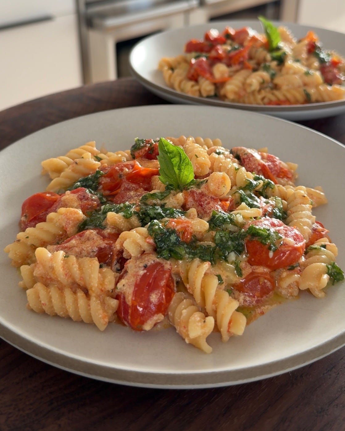 You can make the most magical and creamy pasta if you roast tomatoes and ricotta and then mix in some garlic and pasta. It gets finished with a delicious basil and Parmesan-infused oil.